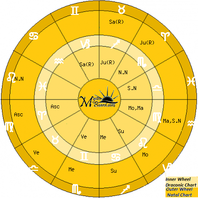 Draconic astrology is as important as tropical astrology itself, with the specialty that it stresses certain aspects of life with extra magnitude. Please press the BACK button and enter all required details.Planetary Position Comparison | | Sun | 07 Sag 19 | 01 Leo 29 | | Moon | 09 Cap 35 | 03 Vir 44 | | Mercury | 17 Sco 30 | 11 Can 39 | | Venus | 23 Lib 08 | 17 Gem 18 | | Mars | 02 Aqu 51 | 27 Vir 00 | | Jupiter | 25 Ari 51 | 20 Sag 01 | | Saturn | 11 Tau 42 | 05 Cap 52 | | North Node | 05 Leo 50 | 24 Sco 09 | | South Node | 05 Aqu 50 | 00 Lib 00 | | Asc | 04 Vir 03 | 28 Ari 12 |
